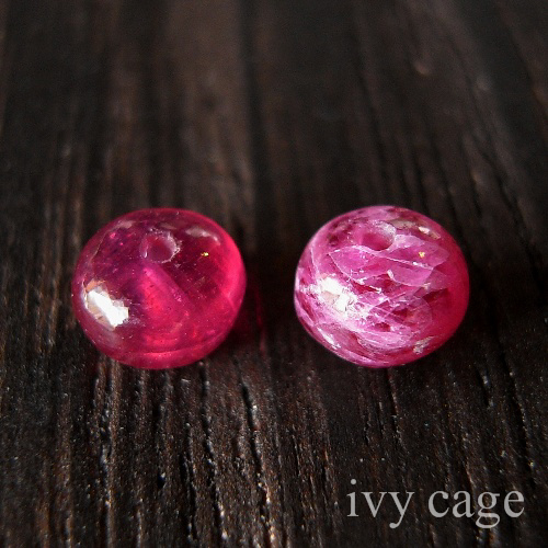 画像の2つのルビーは同じ含浸ルビーのビーズ。右側は薬品で少しガラスを溶かし出したもので、傷の多さがよく分かります。