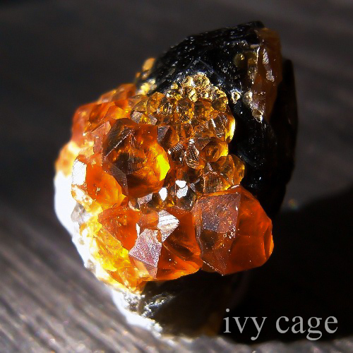 黒に近い半透明のスモーキー・クォーツのポイントに被さるように、明るいオレンジ色のスペサルティン・ガーネットの結晶が成長しています。よく見るとクォーツ内部に入り込んでいるものもあります。