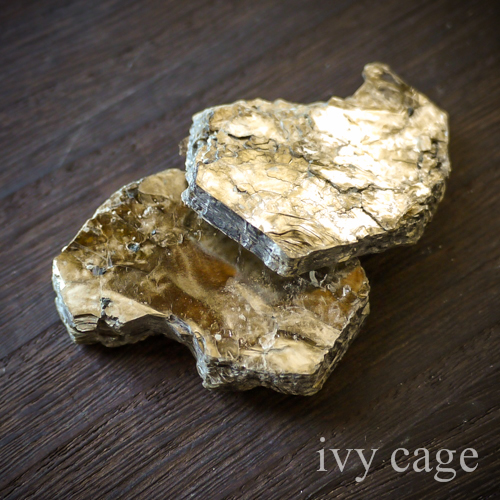 「千枚はがし」とも呼ばれるように、一方向に完全な劈開を持ち、薄く剥がれやすい性質を持っています。七宝の焼成では、釉がこぼれても簡単に剥がせるように、胎の下に薄く広い雲母を敷いて使うこともあります。