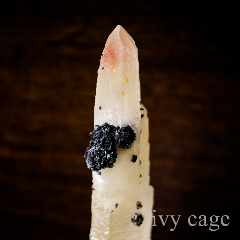 表面の細かな蝕像、小さなブーケのようなヘマタイト、ヘデンバーガイトを内包したミルク色に、内部のアメシストが透けたチェリートップ。
