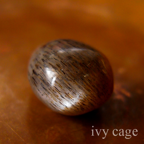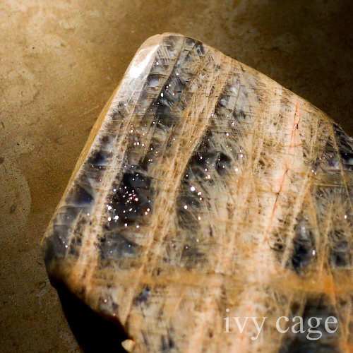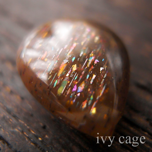 ある角度からは平行に並んだレピドクロサイトやヘマタイト等の内包物によるアベンチュレッセンスとシャトヤンシー(キャッツアイ効果)やアステリズム(スター効果)、また別の角度からは白いアデュラレッセンスが見られる、恐らくはマイクロクリン(微斜長石)が主となったもの。