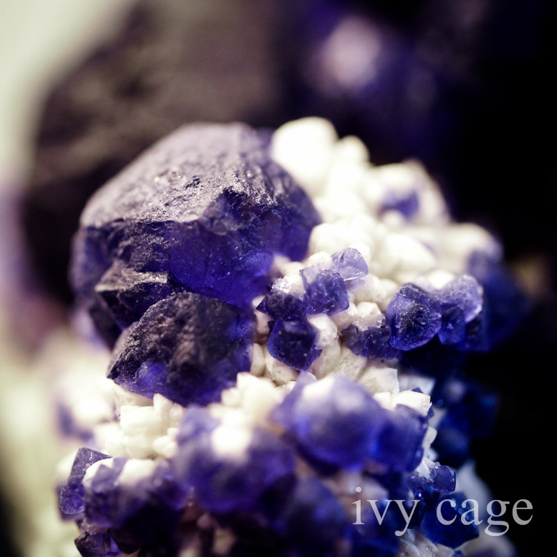 小さく真っ白な水晶がびっしりと埋め尽くす土台に、濃い藍色のフローライトの大小様々な結晶がこれでもかと生えています。
