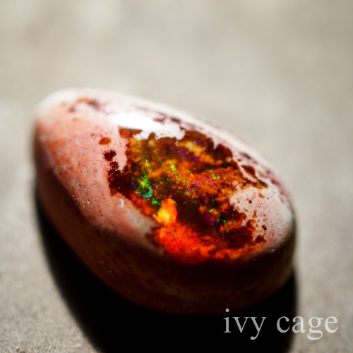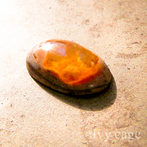 オパール部分は遊色を示すプレシャス・オパール。虹色のファイアを浮かべる赤~オレンジ色のオパールの底に凸凹とした母岩との境目が透けて見える様子は、まるで燃えるような夕焼けの空や、乾燥した土地にぽっかりと開けた深い湖のような風景を想わせます。